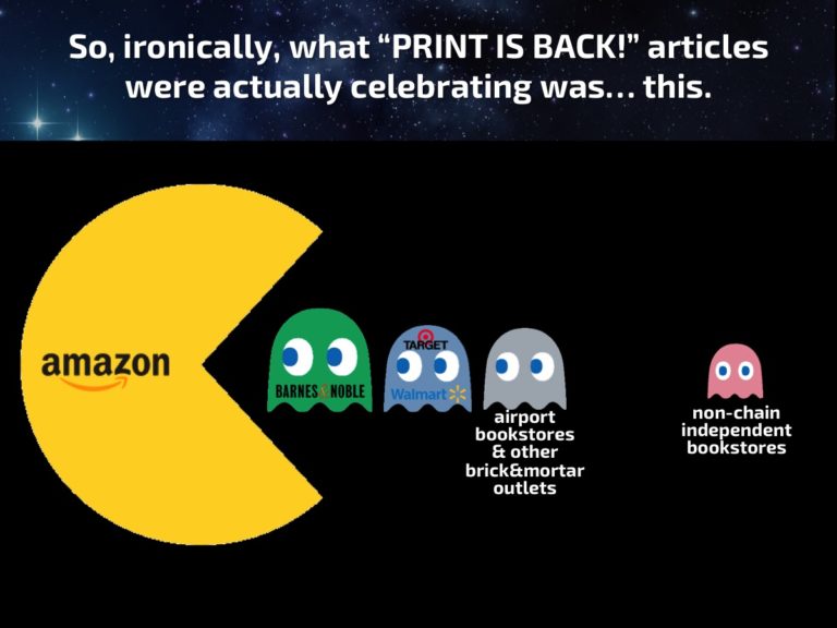 Not according to Author Earnings, who say the reason print sales increased in 2016 was mostly because of aggressive discounting from Amazon … which leads to print books from major trade publishers costing about the same as the ebook versions (which a lawsuit says Amazon are not allowed to discount).