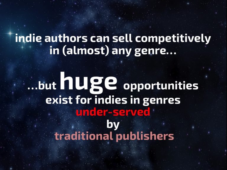 The other genres where traditional publishers have retained online market share include reference books, biography/memoir, self-help, textbooks, and thriller/suspense novels. None of those surprise me: most are genres I’d expect people to prefer to buy in paper.